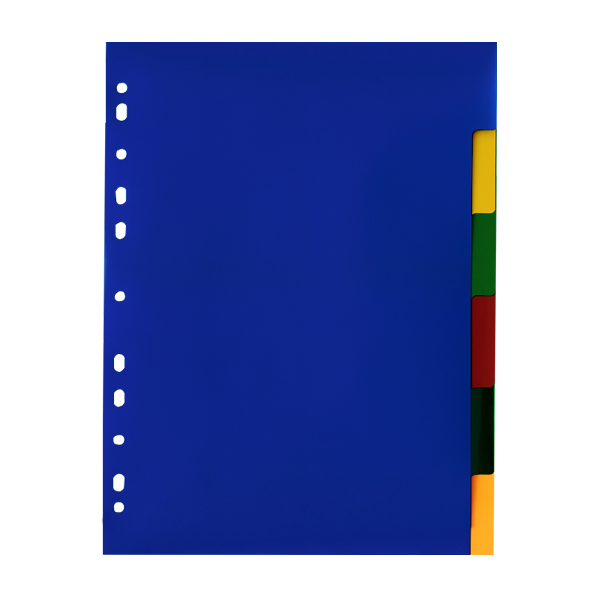 Sous référence: 2000009Jeu d’ intercalaires 6 positions en polypropylène souple avec un assortiment de couleurs vives pour vous offrir un repérage facile à votre répartition. Indispensable pour la séparation et le marquage de vos documents à l’intérieur des classeurs. Conçu avec une perforation universelle de 11 trous qui s’adaptent à tous types de classeurs. Disponible en format A4 & A4 Maxi