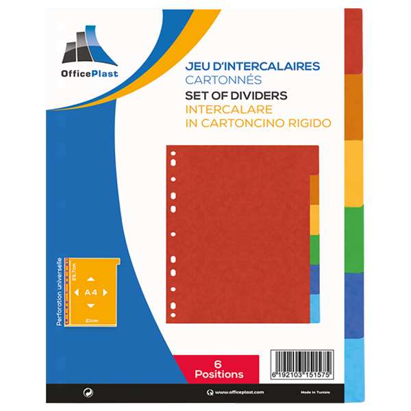 Sous référence: 2000024Jeu de 6 intercalaires cartonnés conçu en carte lustrée à 250g avec un assortiment de couleurs vives.